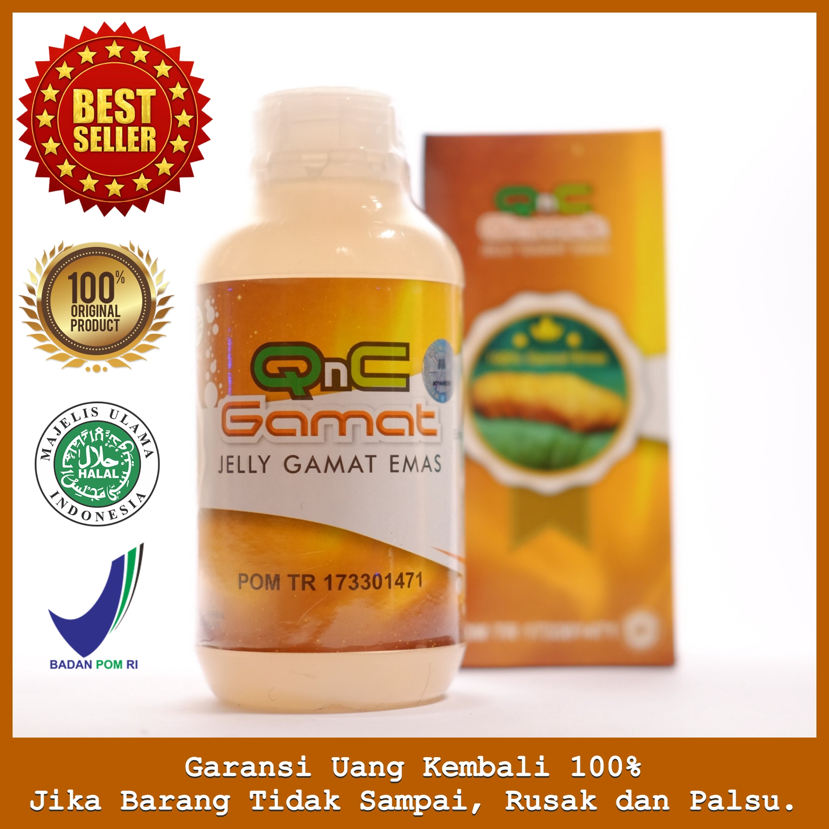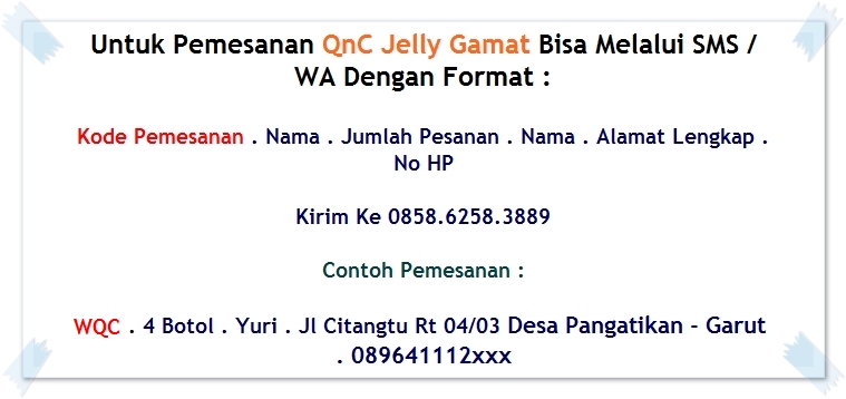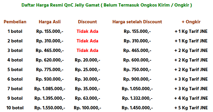 QnC Jelly Gamat ini terbuat dari 100% bahan herbal alami yang bahan utamanya adalah Ekstrak Teripang Emas yang dipadukan dengan bahan alami lainnya, seperti Sweetener Stevia, Air RO (Reverse Osmosis), Essen Natural, Pengemulsi Nabati, serta Ekstrak Buah dan Sayur. Selain bahannya yang alami, QnC Jelly Gamat juga telah terdaftar di BPOM dengan no registrasi POM TR 173301471 dan sudah mendapatkan sertifikat HALAL MUI sehingga sudah terjamin kualitas dan keamanannya.
